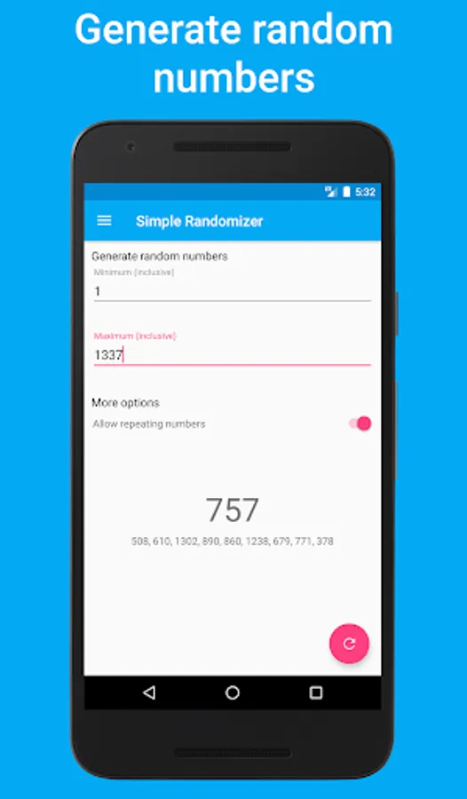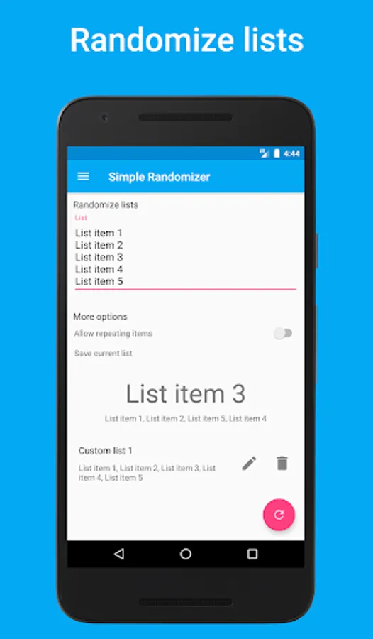 This app is a simple randomizer and random generator for the most essential things, including numbers, lists and colors.
