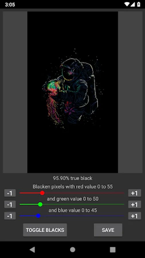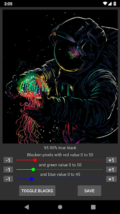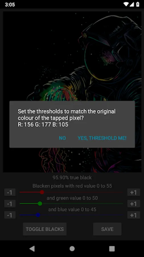 The conversion is tunable by simply tapping the image to choose a threshold pixel, or by using three sliders, to control the threshold for Red, Green, and Blue values that will get dropped to 0, and a live preview is shown before choosing to save.