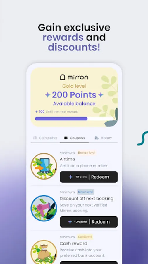 Earn 40 points just for completing your profile, and another 40 points for every booking you make. Plus, leave a review or share photos of your experience and earn additional 30 points. With the potential to earn up to 300 points, you can receive amazing rewards! Don't miss out on the chance to elevate your beauty routine with Mirron - download the app today!