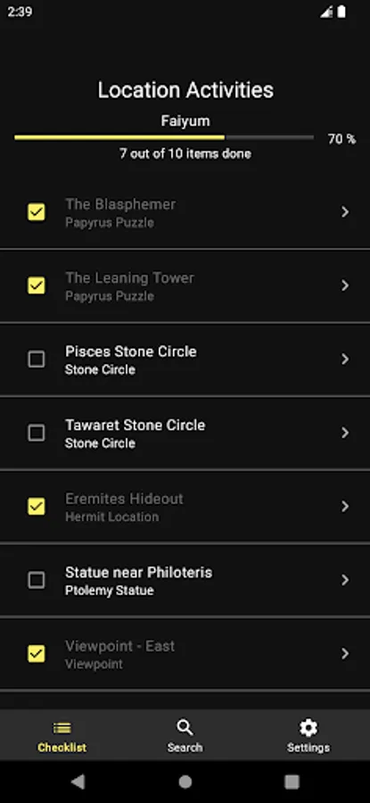 Location activities: various activities such as Stone Circles, Hermit locations, War Elephants, Ptolemy Statues, Tombs, and Viewpoints.