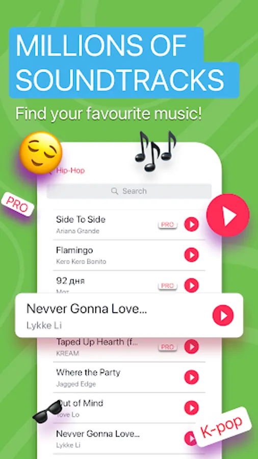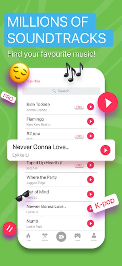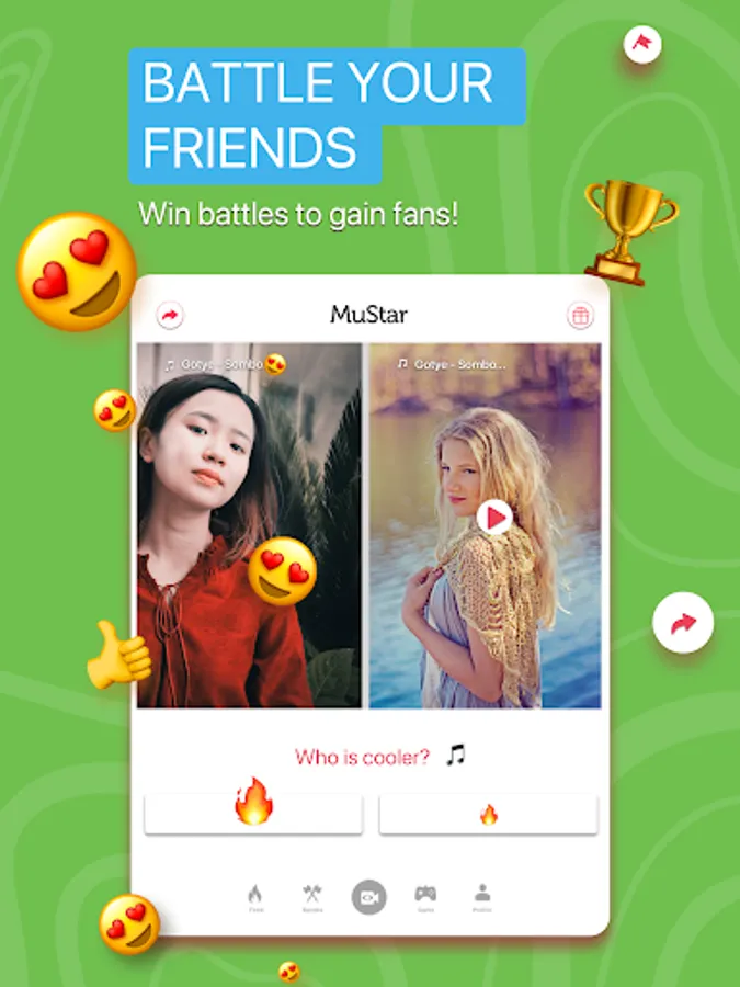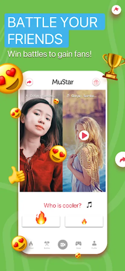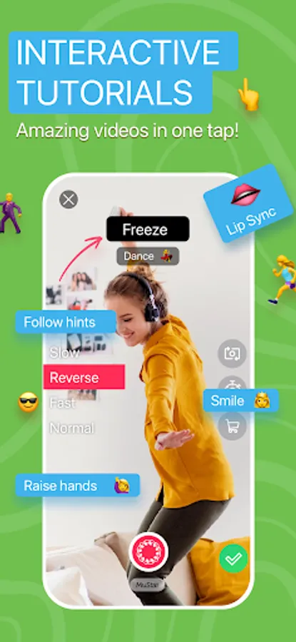 Create amazing musical videos with the MuStar editor. Choose your favourite song out of millions and lip sync or dance to the music in front of your phone camera. Feel free to use your imagination and add one of the app's beautiful special effects (slow motion, fast, reverse, Black and White, Shine and dozens of others) to gain subscribers and become famous!