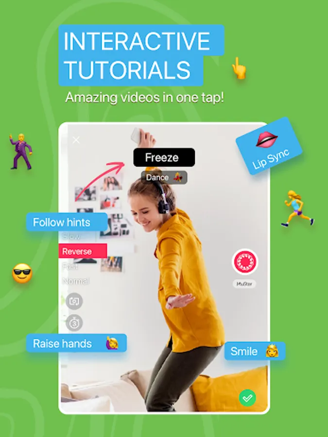 - Unique lip sinc and dance clips game mechanics developed by MuStar Team. It's time to enjoy the music!