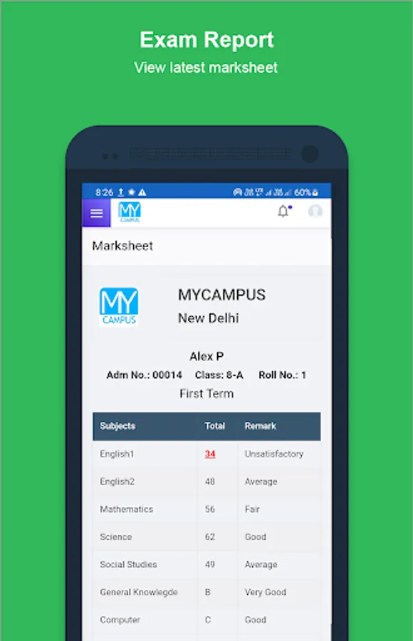 Attendance Report : You will be notified instantly, when you kid is marked absent for a day or class. Attendance report for the academic year is available readily with all the details.