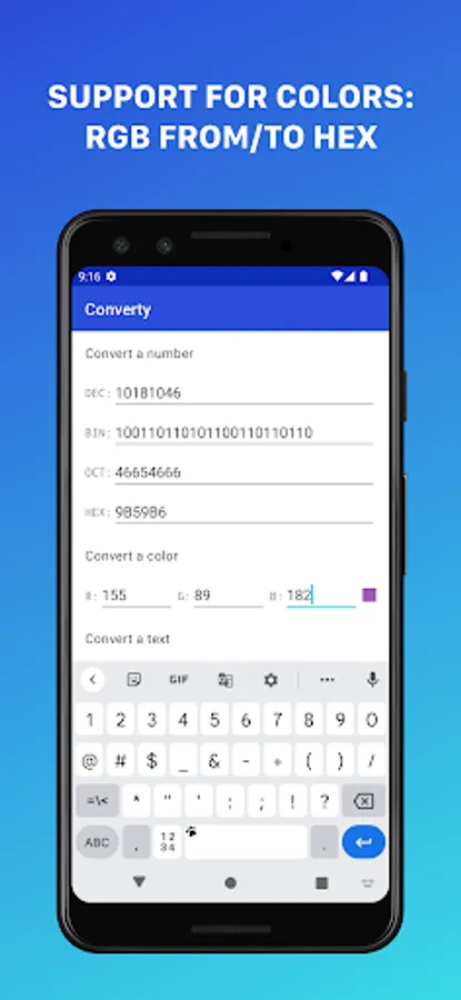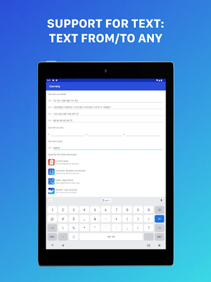 Also, the app supports text conversion to any base (the most useful one is hexadecimal)