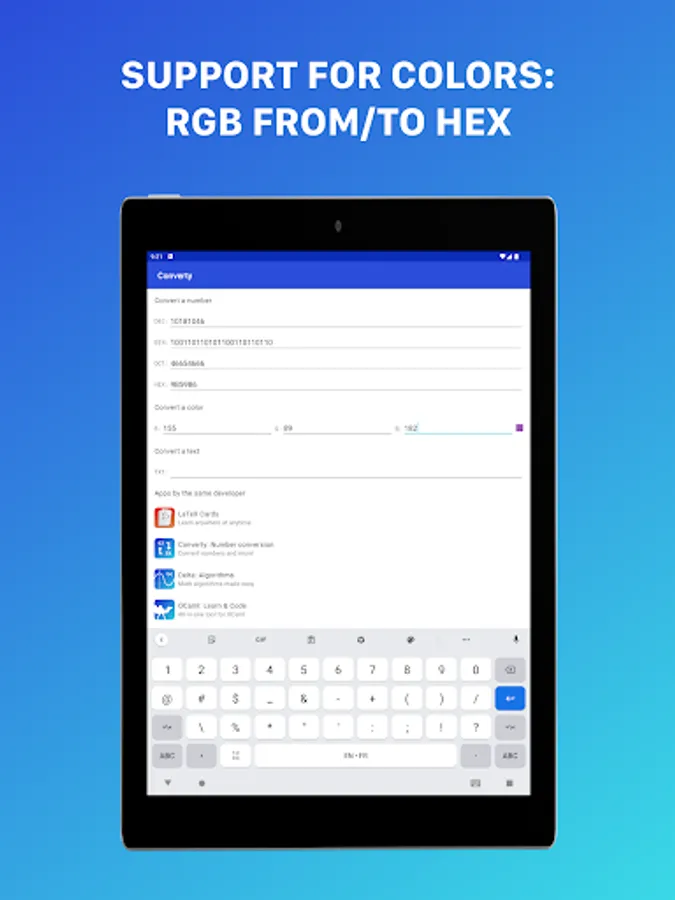 A lot of designers are required to convert colors from RGB to hexadecimal and vise versa. The app can do it for you!