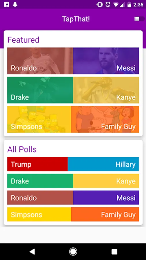 A simple and fun platform to vote on polarizing topics that you feel strongly about. Make every vote count and have a say on who is the best in their field.