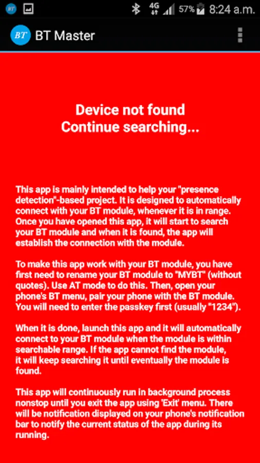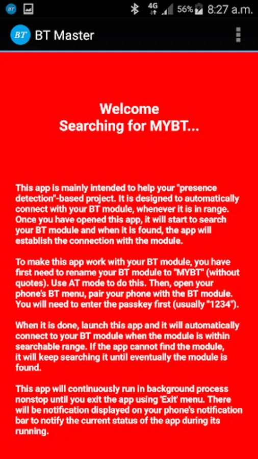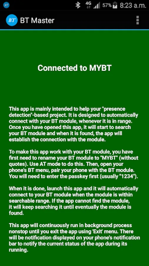When it is done, launch this app and it will automatically connect to your BT module when the module is within searchable range. If the app cannot find the module, it will keep searching it until eventually the module is found.