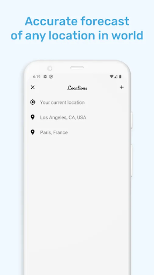 - Any location, get weather forecast of your current location via GPS or any location in the world via search by name.