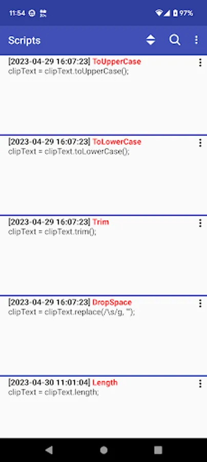 * This can execute text processing by using scripts (JavaScript code). This includes sample scripts such as "to upper case", "to lower case, "text trim", "drop space", "text length", "line number", "eval", and "sum". This also includes the script editor.