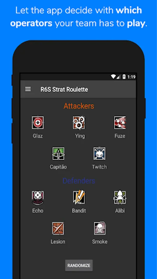 The app also includes a team randomizer that decides with which operators your team has to play and an Operator randomizer.