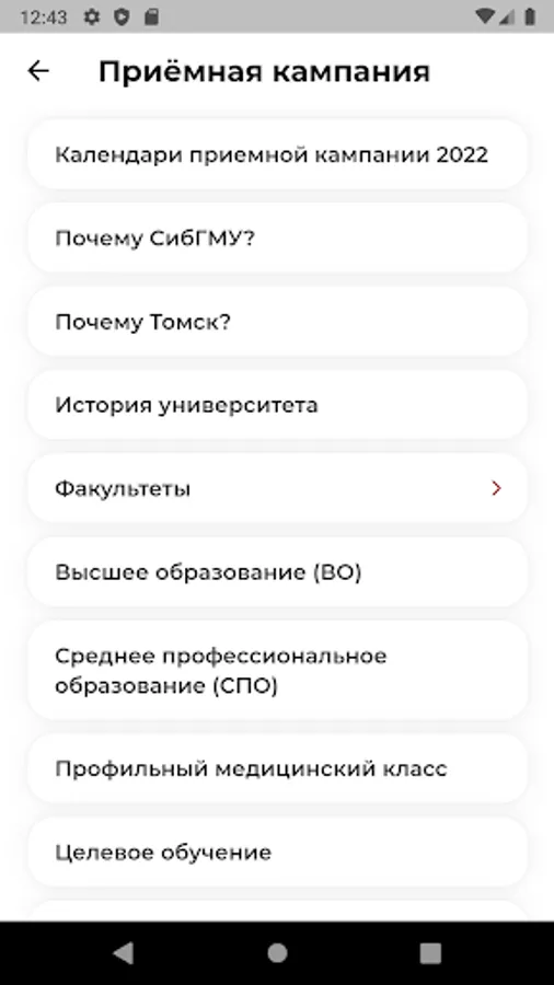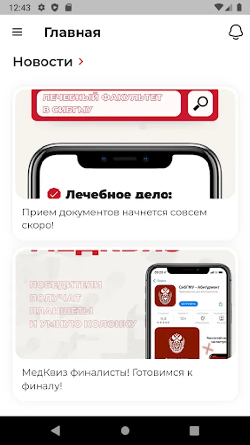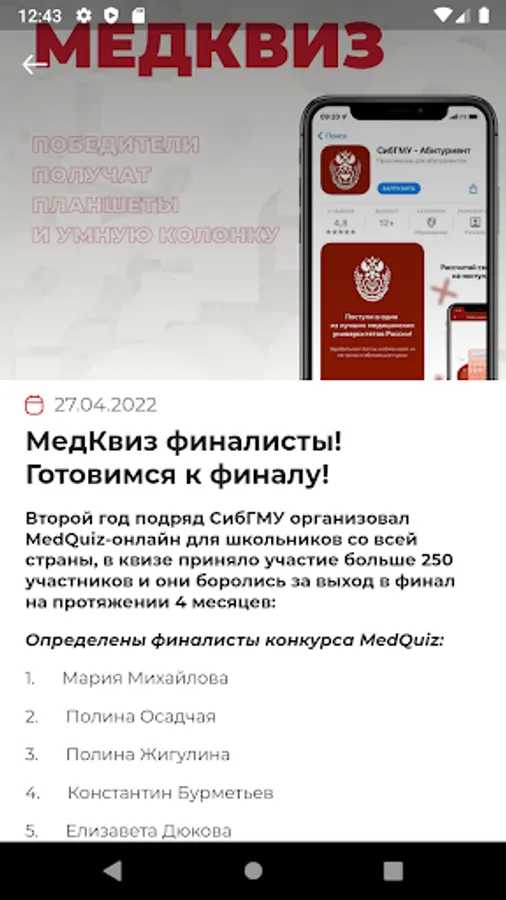 Using our application, you can keep abreast of all the news and events of the university, for participation in which you will receive bonus points that you can exchange for the brand attributes of SibSMU. Based on the points for the exam exams, choose a suitable specialty for admission during the admission campaign, the details of which you can find in the corresponding section "Admission Campaign 2020".