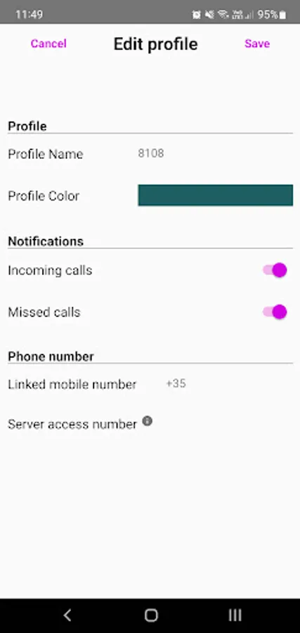 Secured caller identity allowing change of the number shown when you make calls. Easily add profiles with different phone numbers attached. Change them with just a swipe.