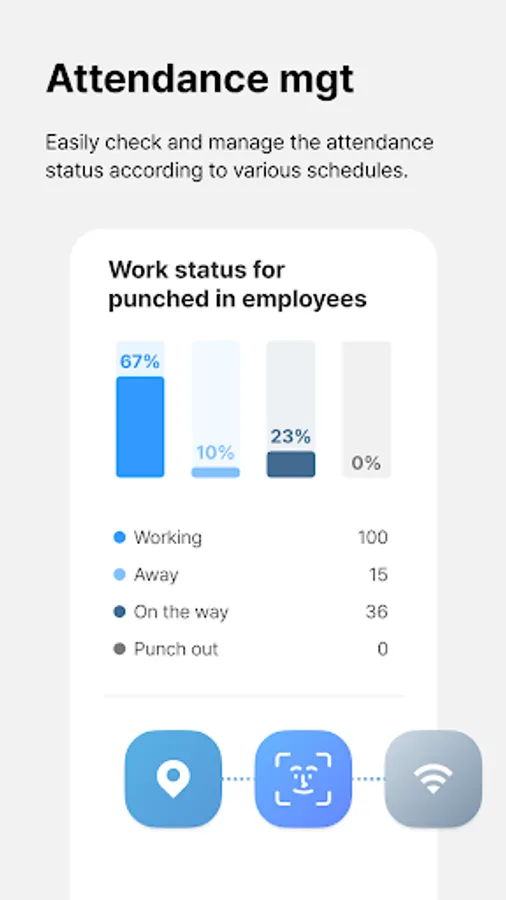 For all employees both working at one and multiple locations, we enable convenient scheduling for visiting workplaces and keeping records of the working hours.
