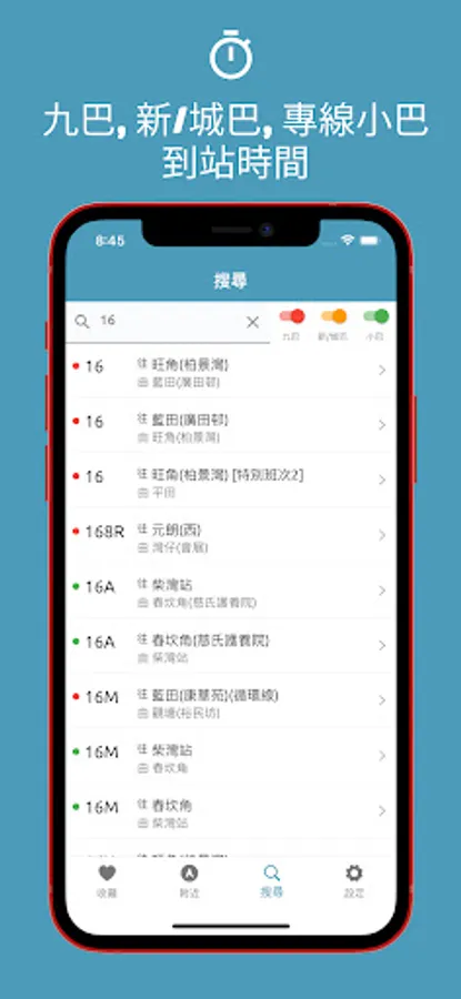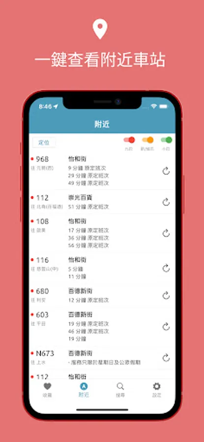 【到站時間】 整合了九巴、城巴、專綠小巴到站時間,讓你方便查看各類巴士到站時間。