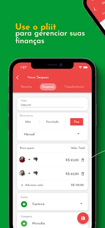 In Pliit you customize financial control according to your reality. Add income and expense categories by whatever name you like, including due date and other information you want. Add accounts and cards at will and customize the app's dashboard so that information is displayed the way you like, matching Pliit's look to your style!