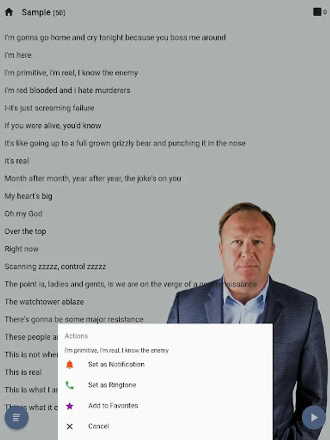 Listen to Alex Jones saying random things and famous sayings. Select words and phrases to be played back.