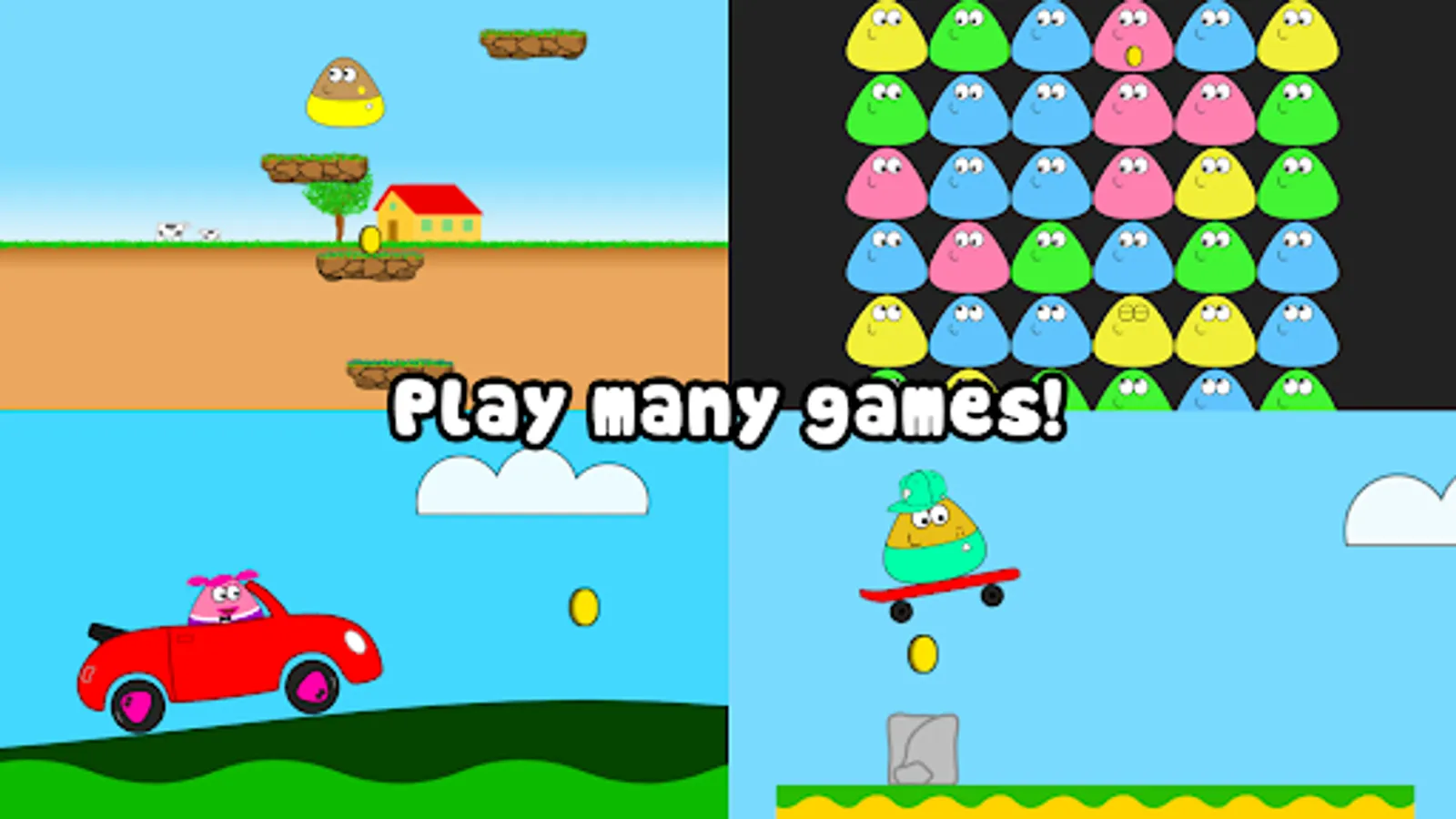 Feed and take care of Pou, and watch it grow! Play Games in the Game Room and collect Coins! Experiment with Potions at the Lab! Customize Pou's appearance! Try out new Outfits, Hats and Eyeglasses! Customize each room's Wallpaper! Unlock Achievements and Special items! Visit and play with your friends! Talk to Pou and listen back!