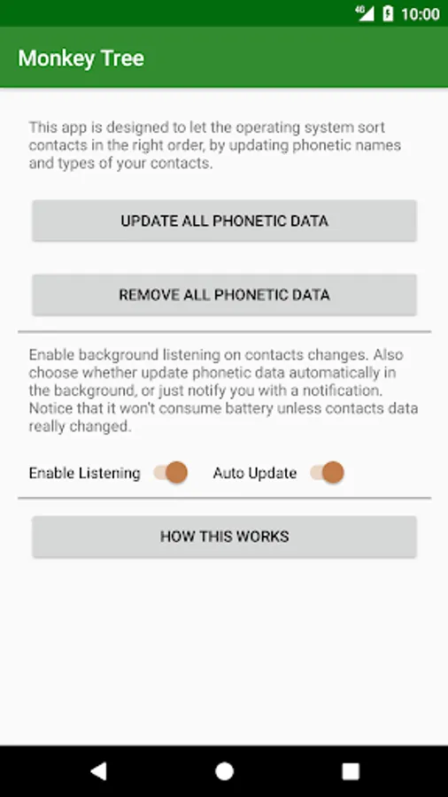 This app is designed to let operating system sort contacts in the right order, by updating phonetic names and types of your contacts.