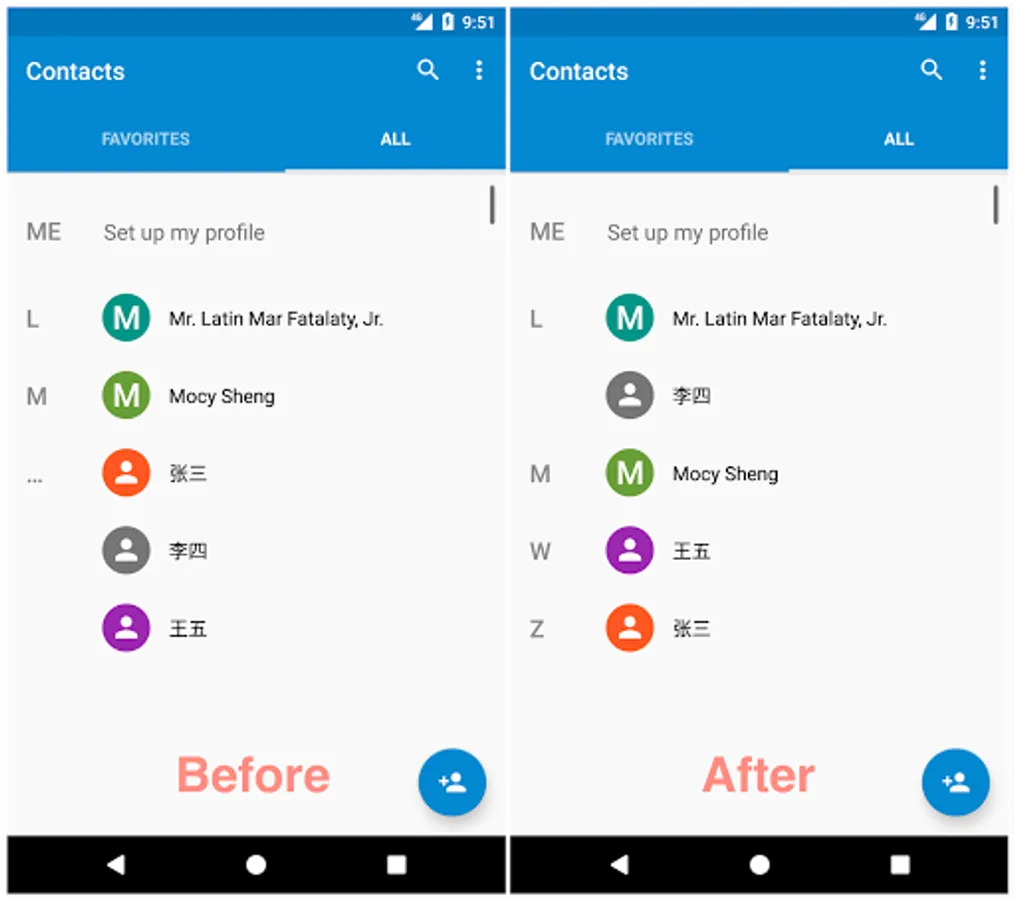 For Latin contacts, phonetic name and type will be removed. So that system will use contact first name to determine the order.