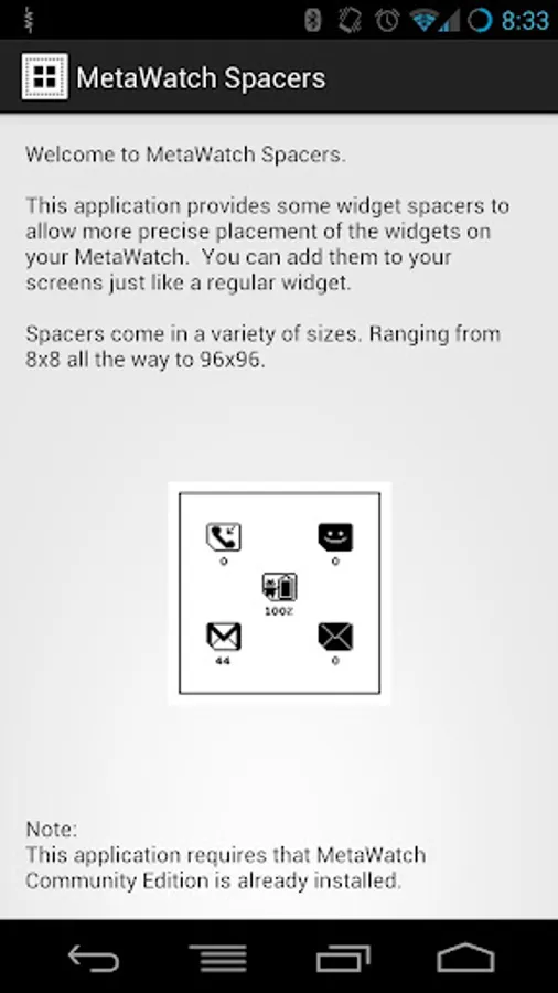 This application provides spacers to allow more precise placement of the widgets on your MetaWatch. You can add them to your screens just like a regular widget.