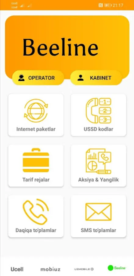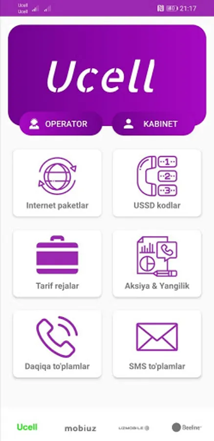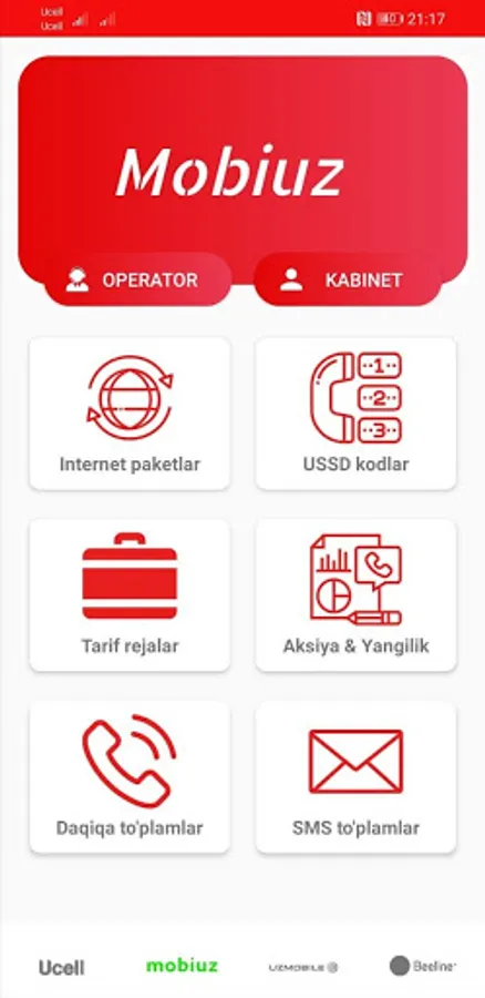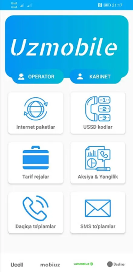 USSD коды всех операторов сотовой связи Узбекистана: Мобиуз (UMS), Узмобайл (Uz mobile), Билайн и Юсел. В приложении все доступные USSD коды операторов, такие как получить список всех платных услуг к которым вы подключены, узнать о доступных бонусных минутах и т.п.