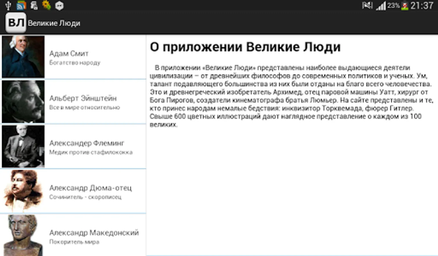 Annex "Great People" presents the most outstanding figures of civilization - from ancient philosophers to modern politicians and scientists. The mind, the talent of the overwhelming majority of them have been given the benefit of humanity. This ancient Greek inventor Archimedes, the father of the steam engine, Watt, a surgeon from God Pirogov, the creators of cinema of the Lumiere brothers. The application submitted and those who brought the peoples of considerable distress: Inquisitor Torquemada, the Fuhrer Hitler. Over 600 color illustrations provide a visual representation of each of the 100 greatest.