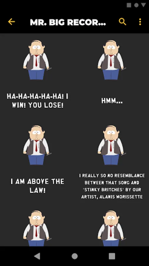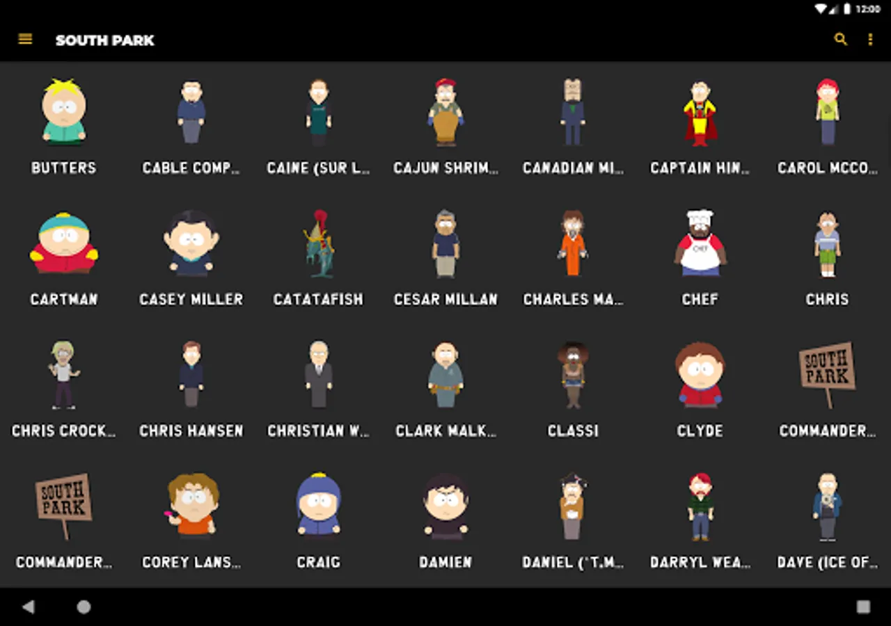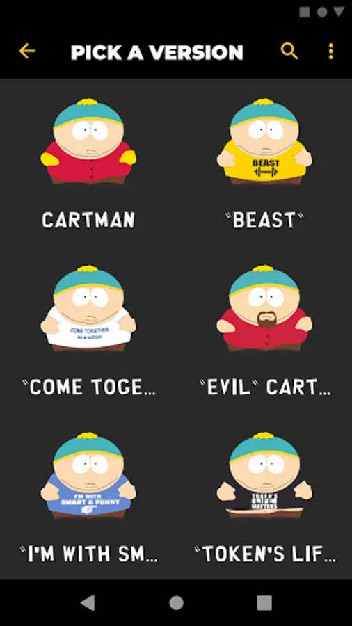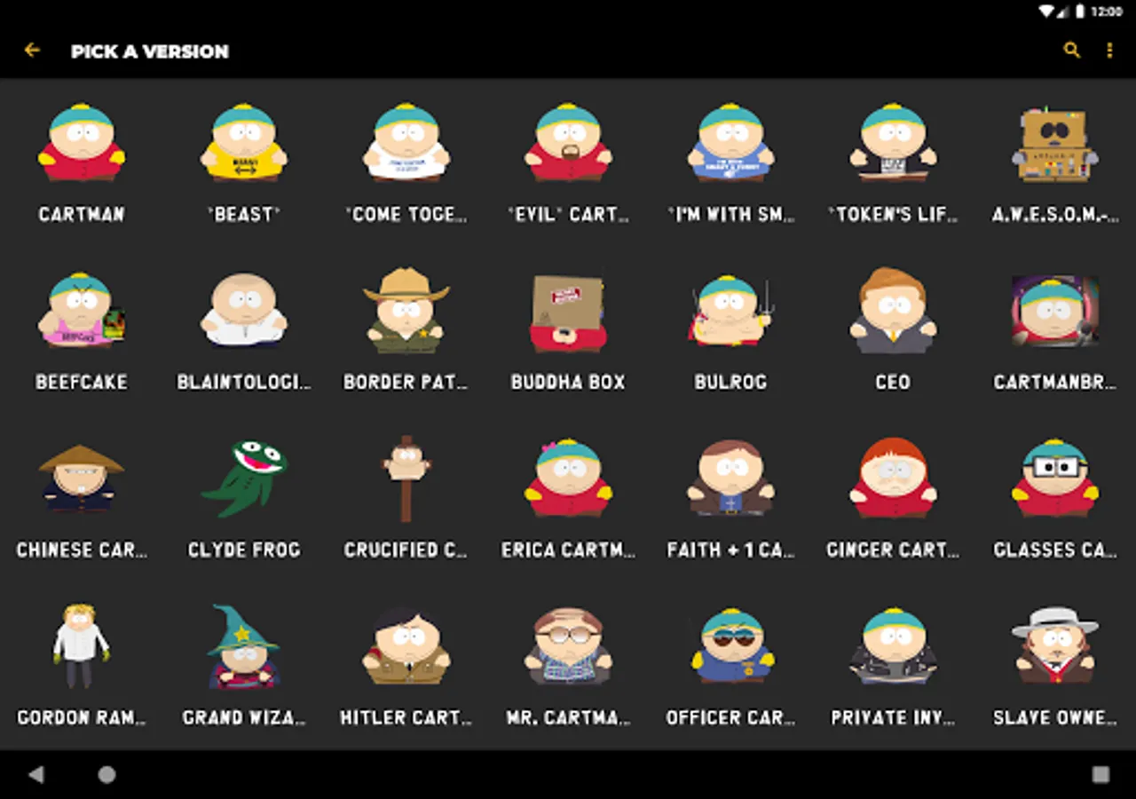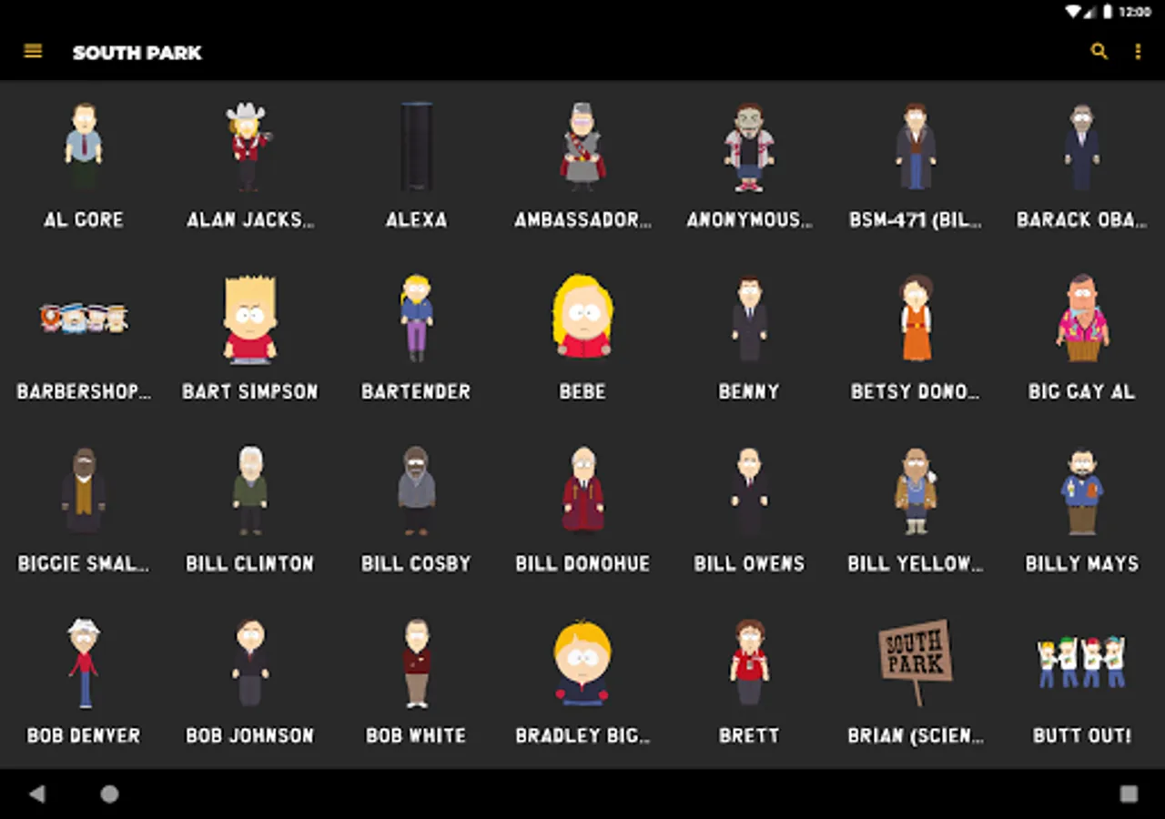 Listen to audio clips from characters such as Eric Cartman, Stan Marsh, Kyle Broflovski, Kenny McCormick, Butters Stotch, Randy Marsh, Mr. Garrison, Clyde Donovan, Craig Tucker, Gerald Broflovski, Heidi Turner, Ike Broflovski, Harrison Yates, Heidi Turner, Jimmy Valmer, Mr. Mackey, PC Principal, Scott Malkinson, Shelly Marsh, Stephen Stotch, Strong Woman, Token Black, Towelie, Tweek Tweak, Wendy Testaburger, Bebe Stevens, Darryl Weathers, Father Maxi, Nichole Daniels, Timmy Burch, Tuong Lu Kim, and so much more, all straight from your Android device!