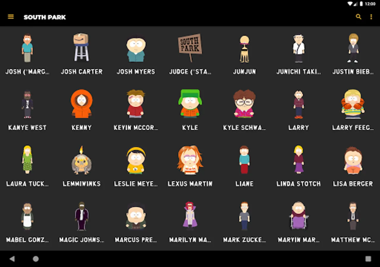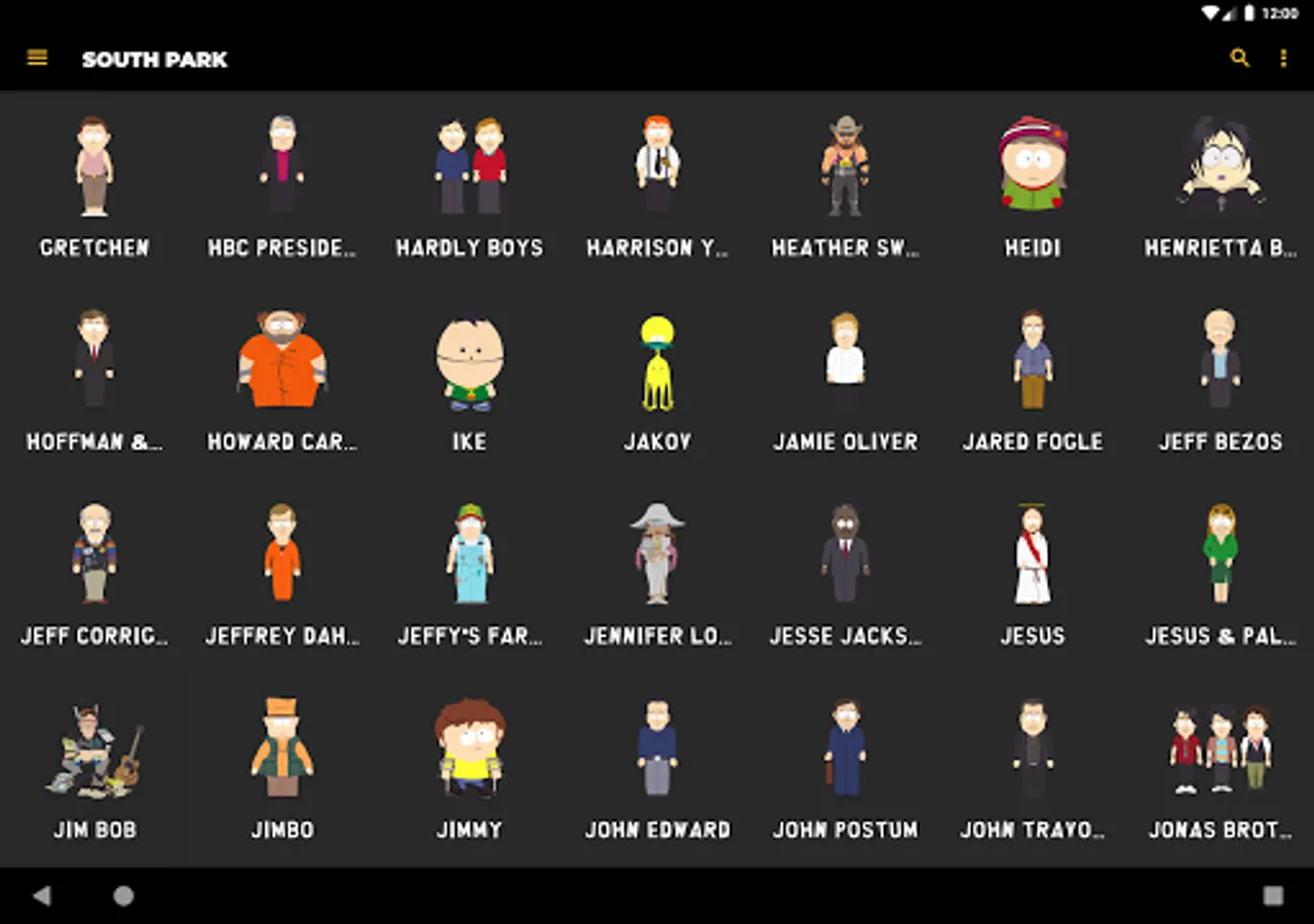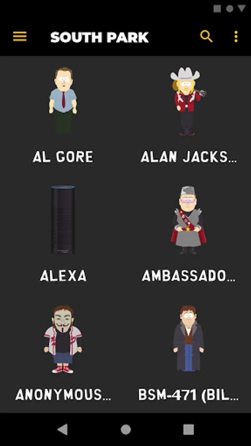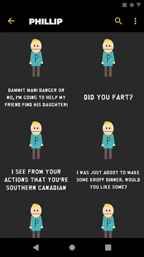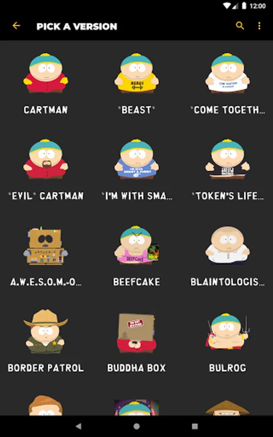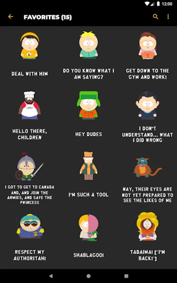 Listen to audio clips from characters such as Eric Cartman, Stan Marsh, Kyle Broflovski, Kenny McCormick, Butters Stotch, Randy Marsh, Mr. Garrison, Clyde Donovan, Craig Tucker, Gerald Broflovski, Heidi Turner, Ike Broflovski, Harrison Yates, Heidi Turner, Jimmy Valmer, Mr. Mackey, PC Principal, Scott Malkinson, Shelly Marsh, Stephen Stotch, Strong Woman, Token Black, Towelie, Tweek Tweak, Wendy Testaburger, Bebe Stevens, Darryl Weathers, Father Maxi, Nichole Daniels, Timmy Burch, Tuong Lu Kim, and so much more, all straight from your Android device!