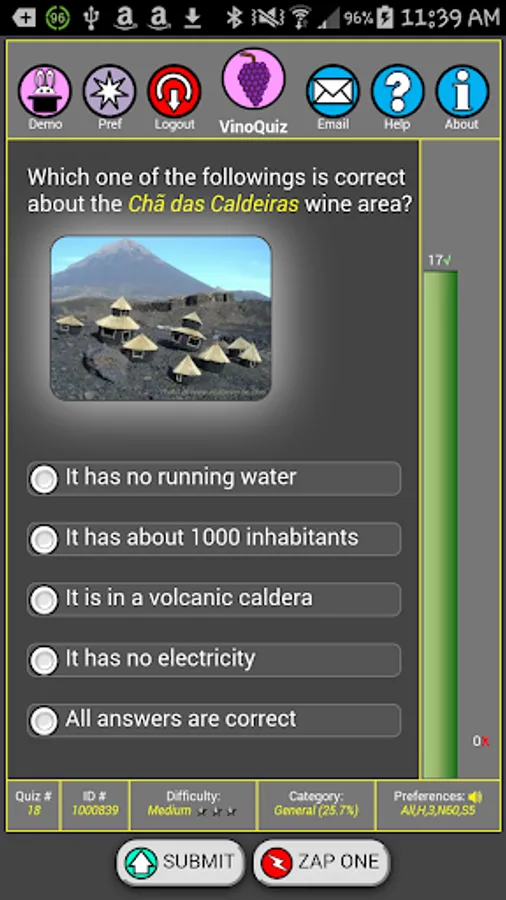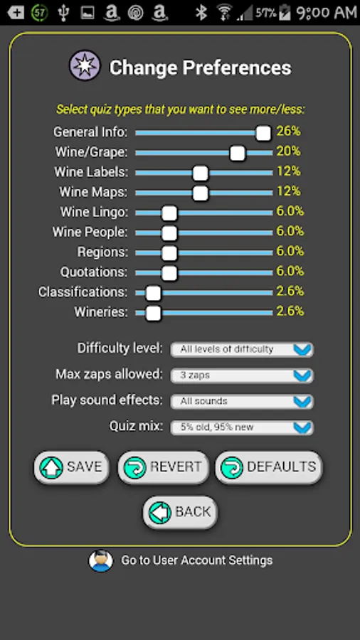 You can choose the degree of difficulty of the quizzes as well as your wine quiz mix from categories like: