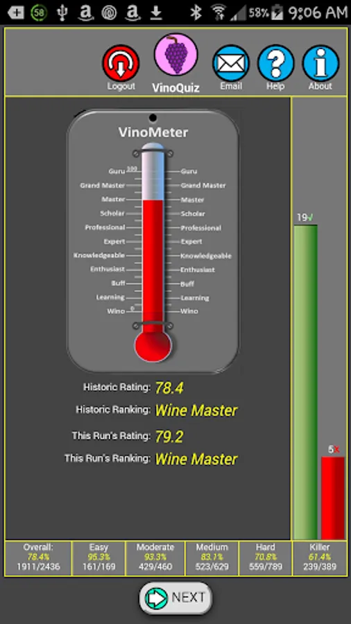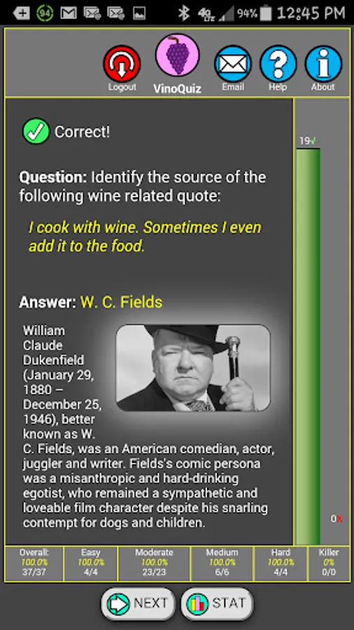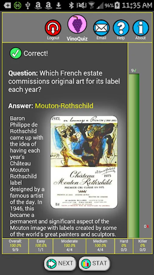 VinoQuiz is the most comprehensive wine related quiz app with tens of thousands of quizzes about wine, grapes, wine regions, wine personalities, wine quotes, wineries and more. It includes complete ranking and rating of your answers with pictorial and informative explanations.