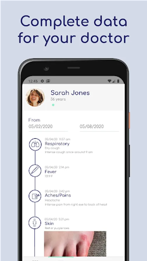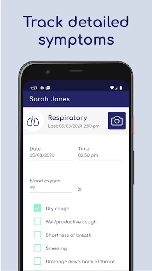 * Track respiratory symptoms, fever, aches & pains, ear/nose/throat issues, eye issues, digestive issues, and skin symptoms in real time.
