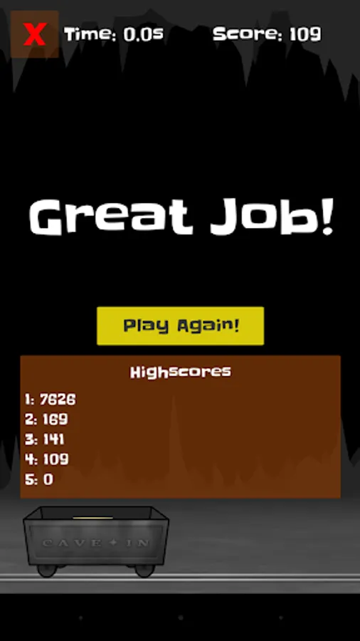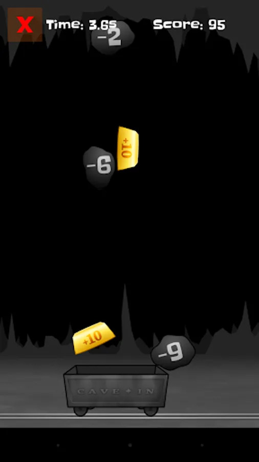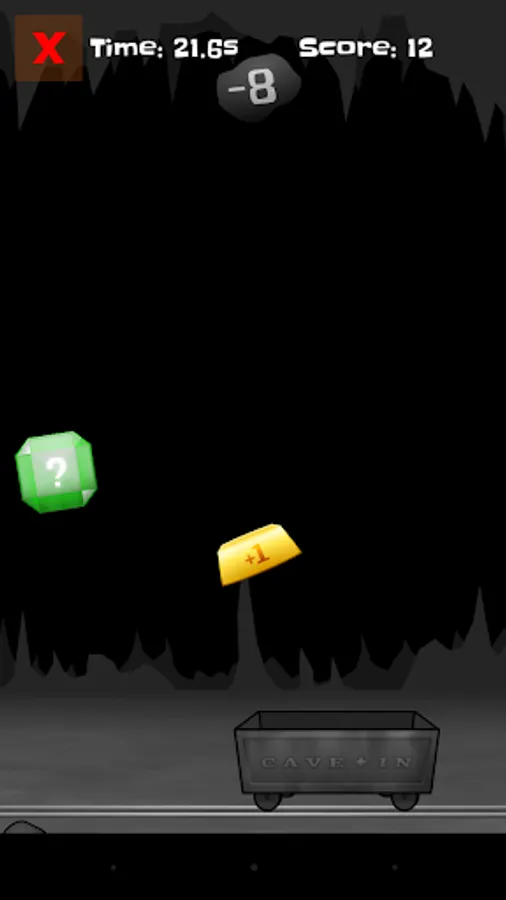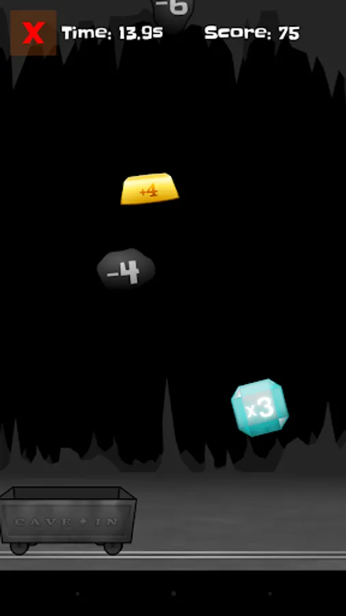 The mine is caving in, and treasure is up for grabs! Collect the valuable gold falling from the ceiling to increase your score, and avoid the coal! Sometimes rare gems will fall; collect them for bonuses like score multipliers, extra time, or other effects. But be wary of the red gem, it halves your score! You have only thirty seconds to get the highest score possible.