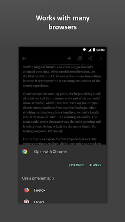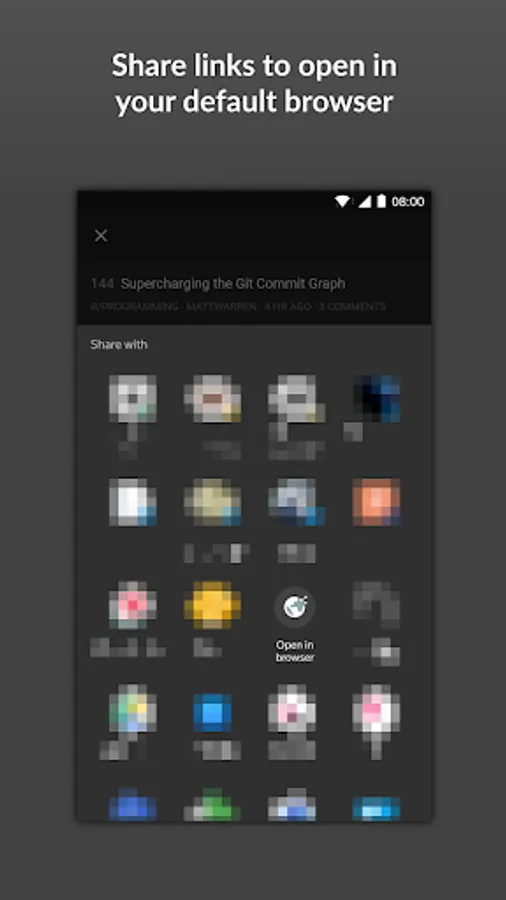 Many applications display web content but don't provide the ability to open it in your default browser. With this little tool, you can workaround this issue by getting an option to open links in your browser through the regular share menu.
