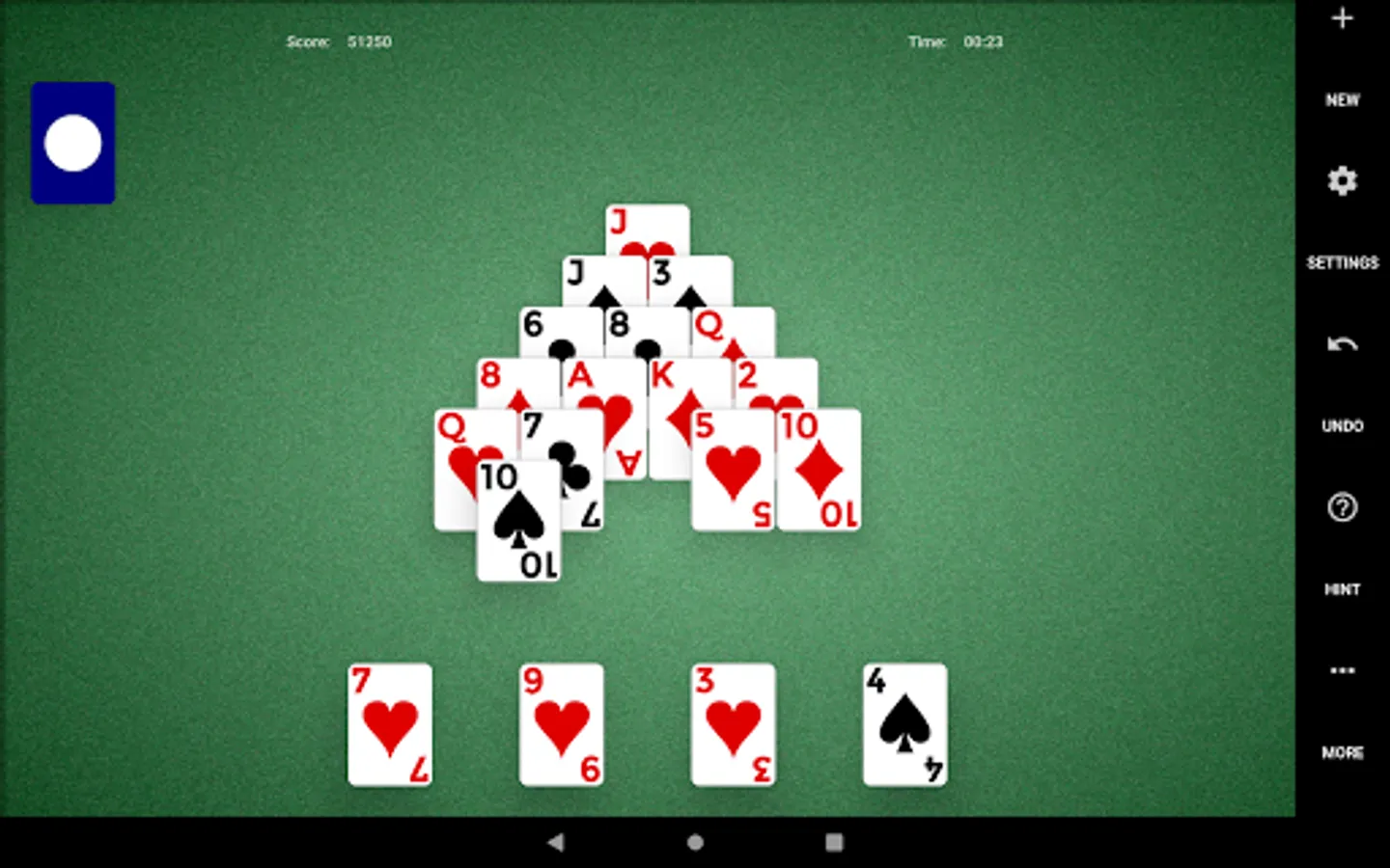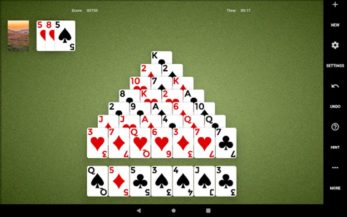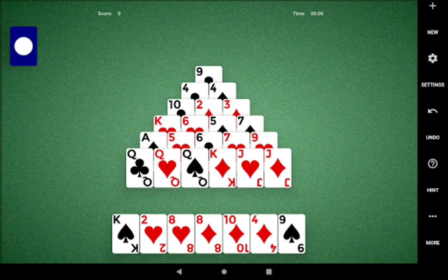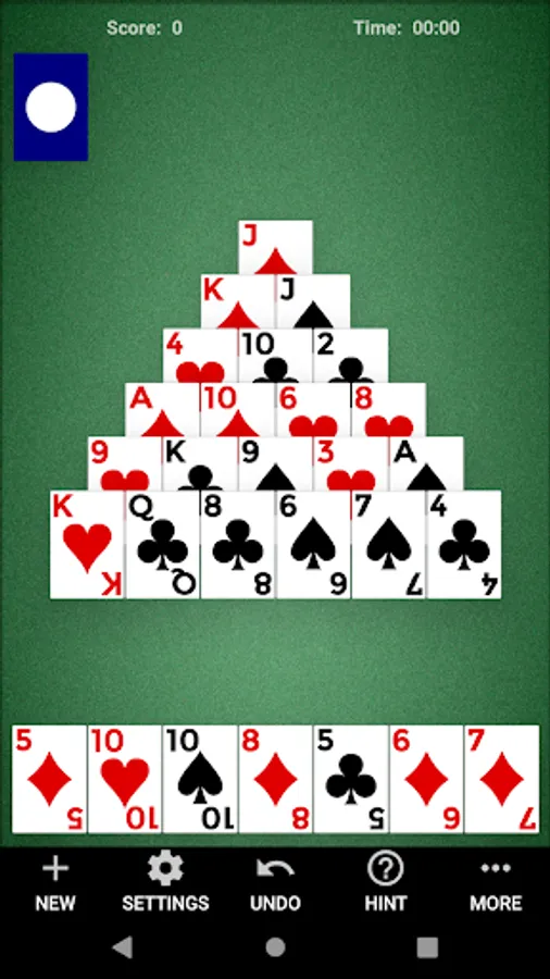 The goal of Pyramid 13 is to remove all 28 cards (21 on 'Easy' difficulty) from the pyramid of cards. To do so, simply tap or drag any uncovered card to another. The values of the two cards must total thirteen. Numbered cards have values equal to their ranks. Face cards (Jacks, Queens, and Kings) have values 11, 12, and 13 respectively (So a 2 and a Jack make a match). Since each King has a value of 13, they can be removed from the card pyramid without being paired with another card.