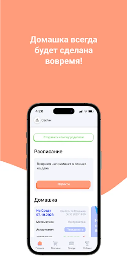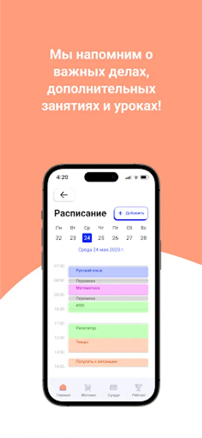 Your child's school schedule is always at hand! Add extra classes and household chores to your schedule, and we will remind your child about them!