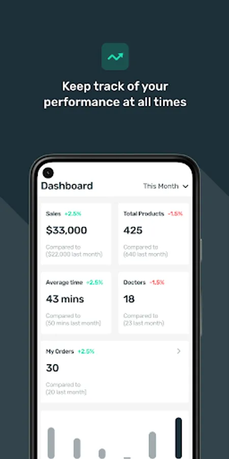 Finally, It helps you in checking your current and past order details, as well as tracking your monthly progress on the app’s dashboard, by viewing the number of dentists served and the number of earnings got by each sales member.