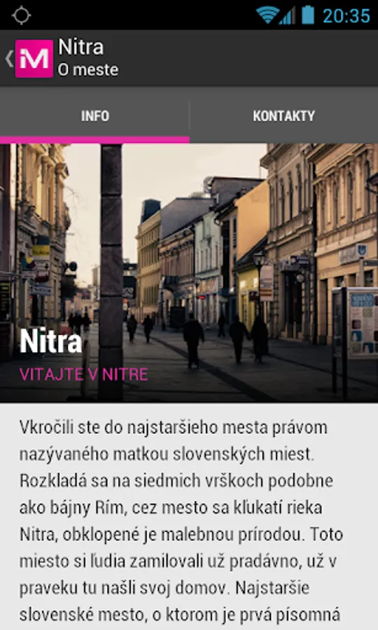 For the application of Mobile City is to simplify people's lives in a direct to their mobile phone to get all the important information about what is happening in the city. Here you will find basic information about the city, sights and events that are held in the town. You can see the restaurants, their menu daily, hotels, bars, shops, various sports, cinema and theater program. We want you to strain to find information on different sites, but the information you have found directly.