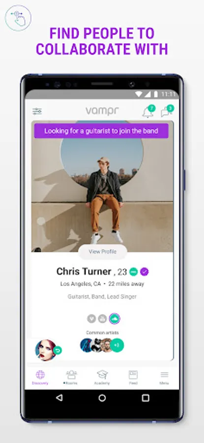 Find musicians, industry professionals and music lovers near you to collaborate with and get discovered. There are over 1M users on Vampr so youβll find everything from singers to guitarists, audio mixers, composers and a lot more. Hire someone for a gig or find your new band member, the possibilities are endless.
