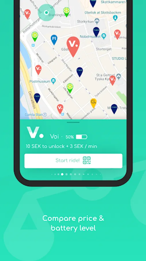 Save time AND money by comparing different scooter's distances, prices, and battery levels in real time. Choose the perfect scooter for your needs and start your ride in just 7 seconds!
