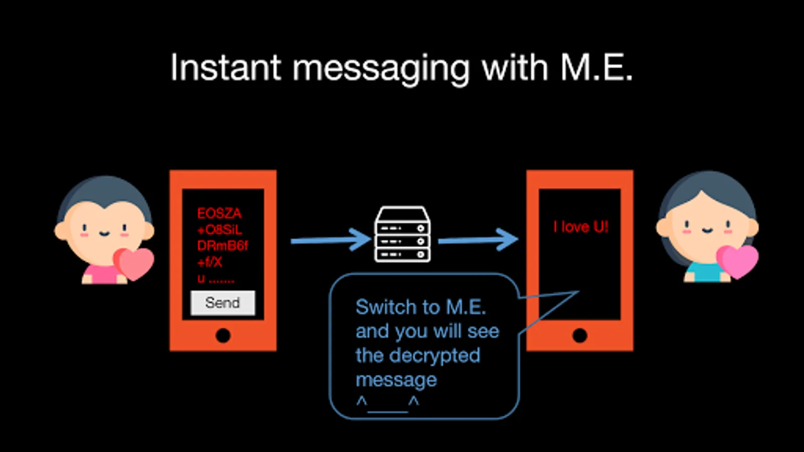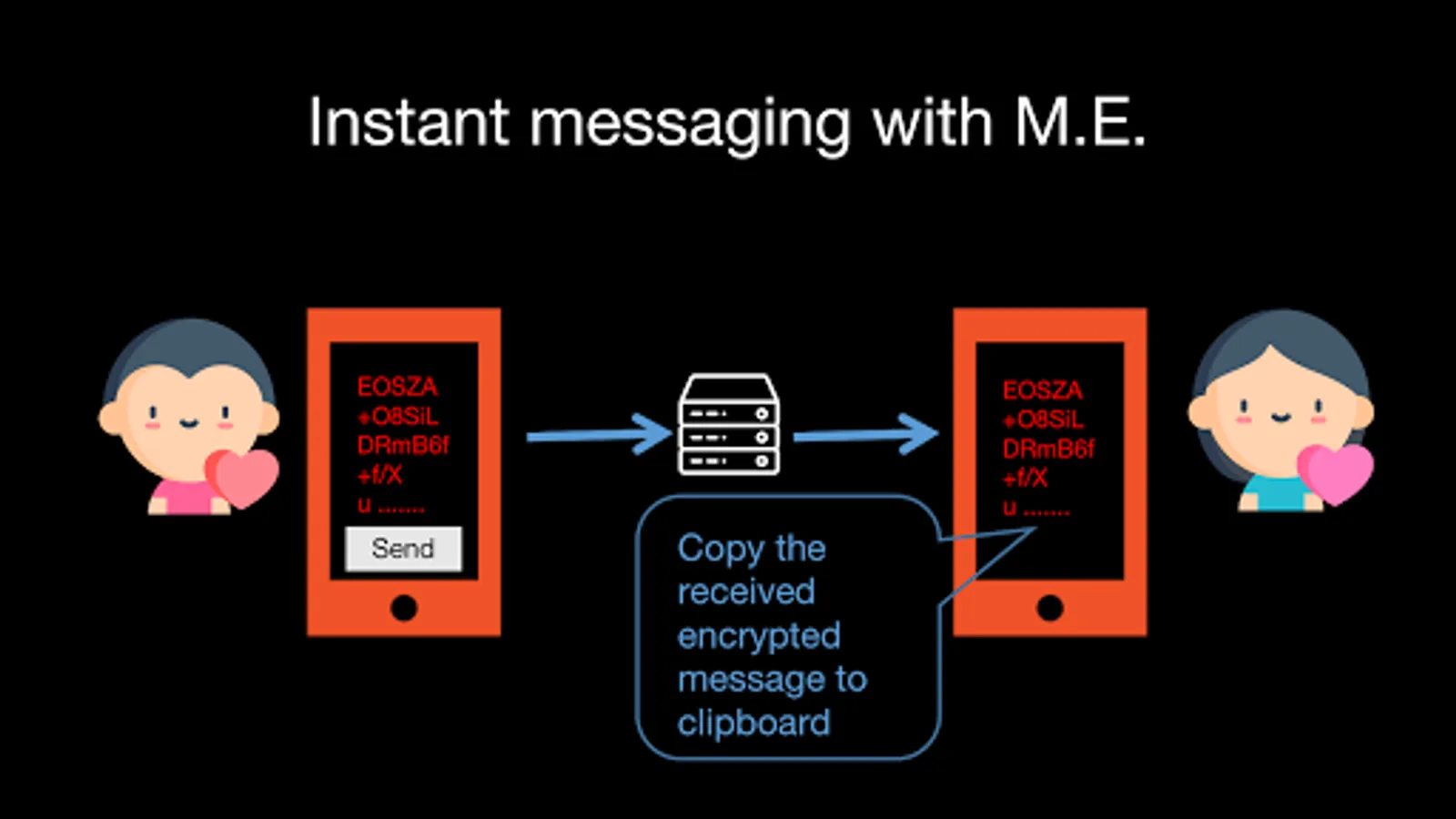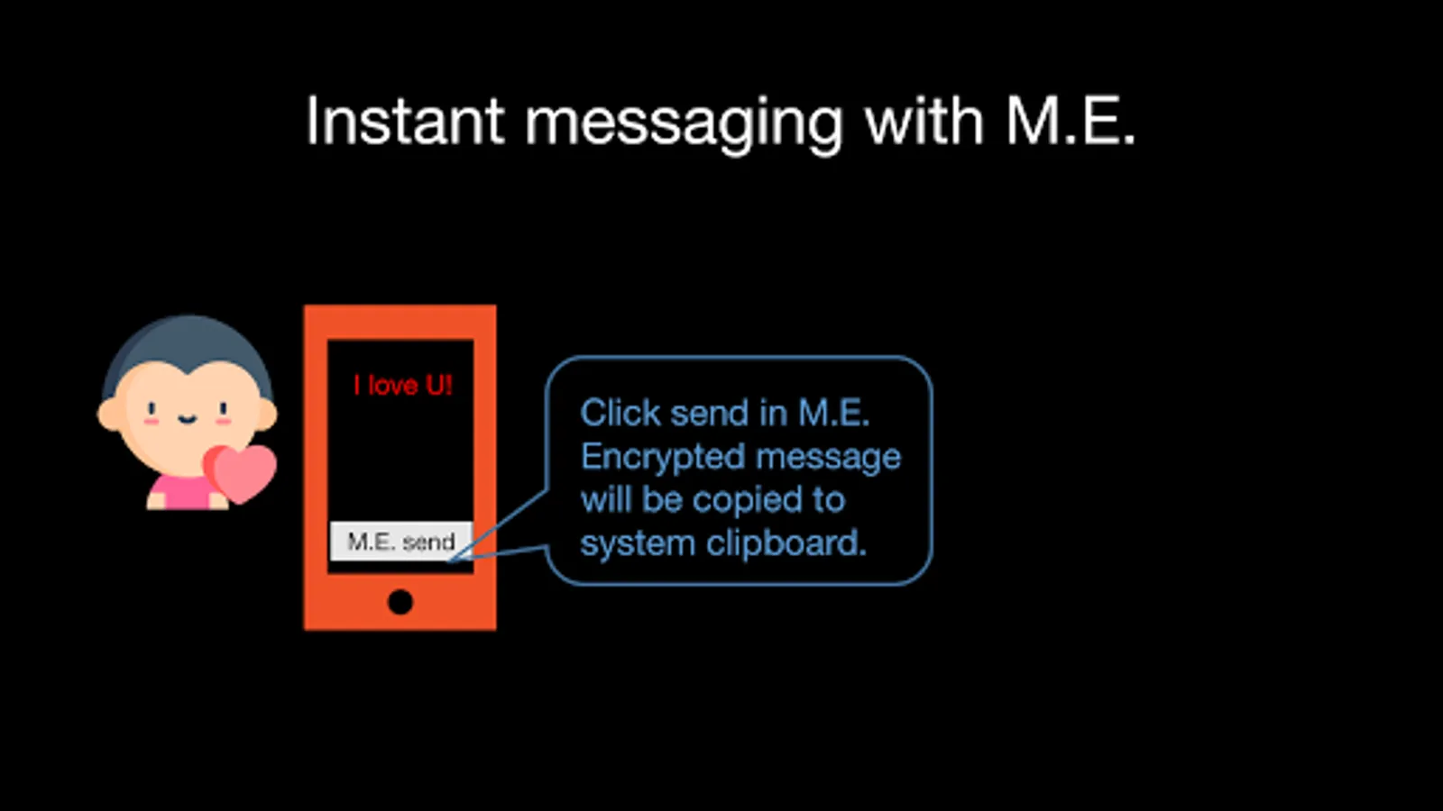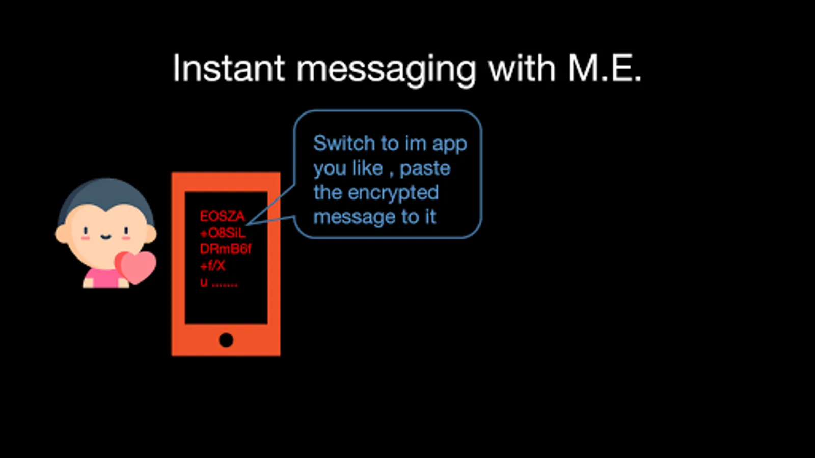 The original intention of M.E. is to provide an encryption layer for any text communication software.