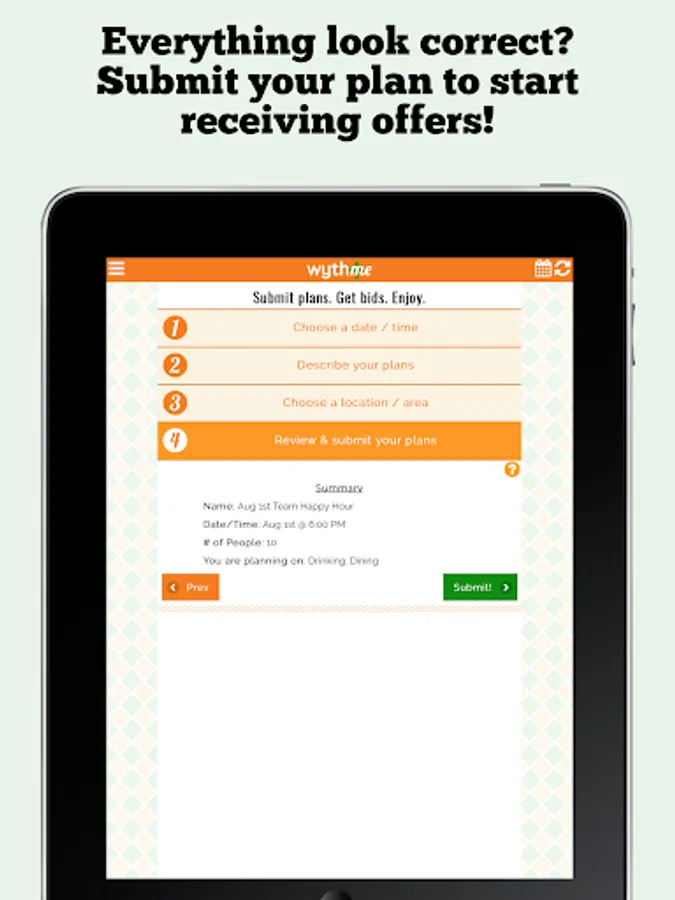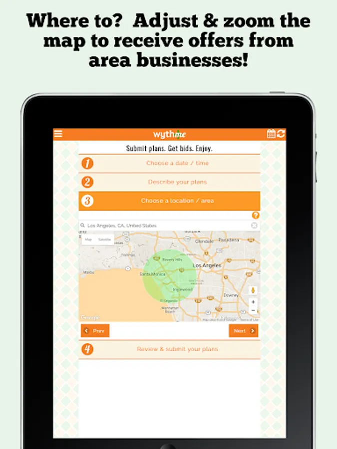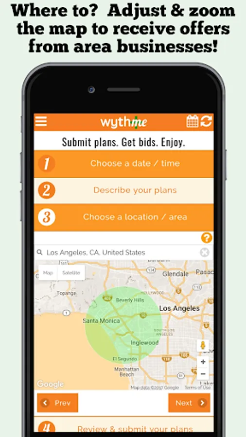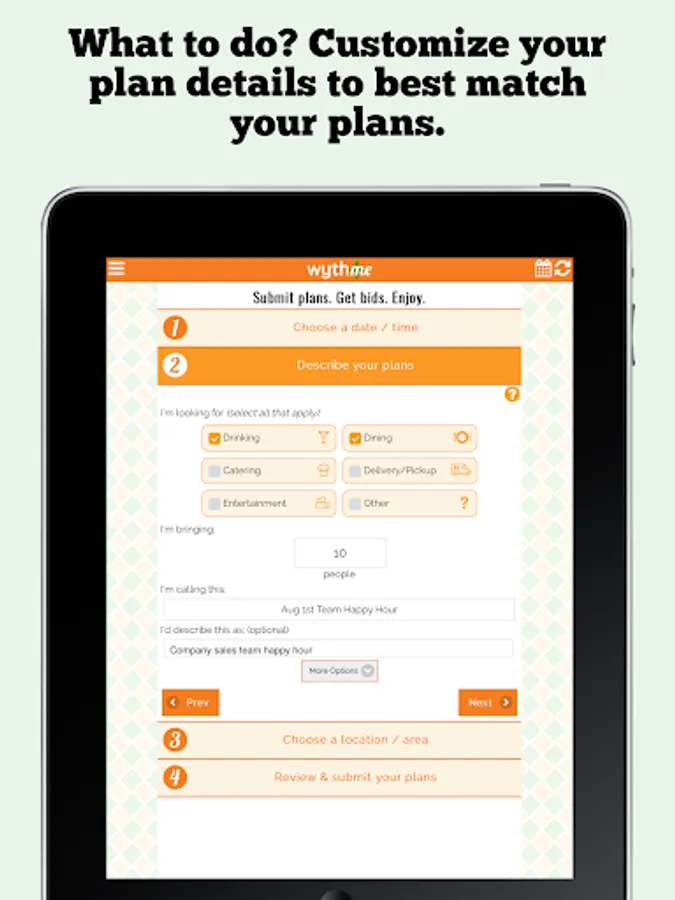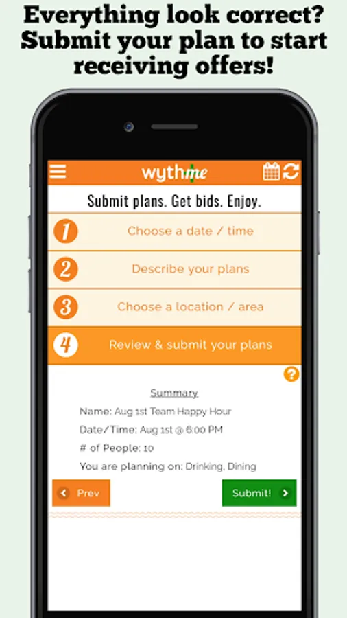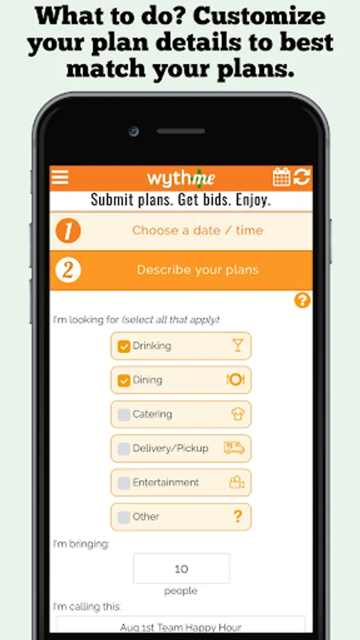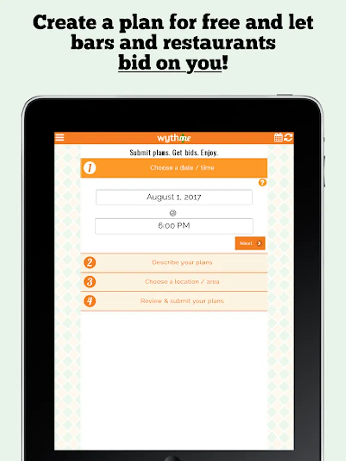 Restaurants bid. You win. WythMe is a free app that gets bars & restaurants bidding on you! Simply enter your plans for lunch, dinner, happy hour, catering, etc., choose an area you'd like to go, and locations in that area will send you unique offers to try and win your business!