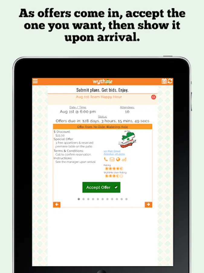WythMe is great for finding places when you're travelling in an unfamiliar area, but also right in your hometown! Whether you're a party of 2 or 100+, you're almost guaranteed to get offers with every plan. You may even discover your new favorite place!