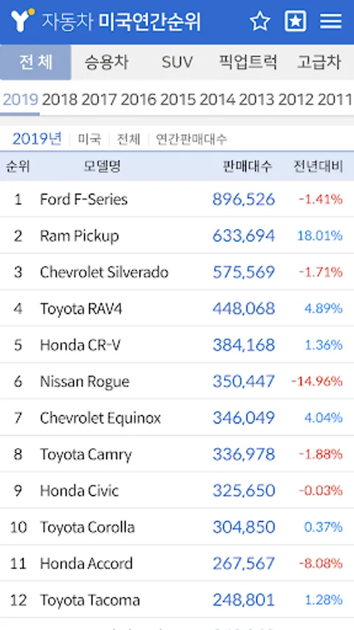 You can check the ranking of the most sold car sales in the US by year by car model.