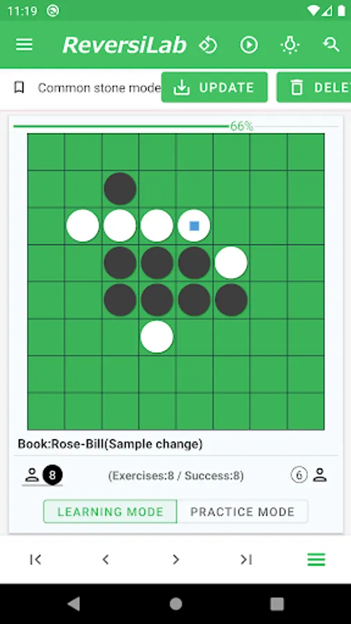 You can view the current rating, best move and book of Othello. You can see how many moves you played and how many you lost or made the best move. You can make the next move that was a loss by learning the best move.