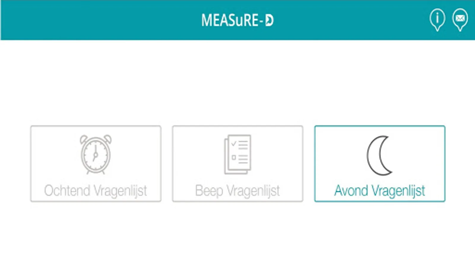The app is designed in a way that subjects will be requested to complete electronic assessments several times a day, at random moments, for seven consecutive days. Every assessment is initiated by an auditory and vibrating signal and assessments are identical between all moments. Since MEASuRE-D is aimed at real-time or momentary symptom assessment, every assessment will be available for only 10 minutes after the signal.
