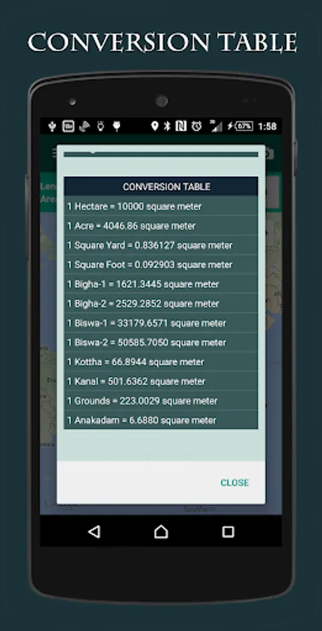 Square Meter, Hectare, Square KM, Square Miles, Acre, Square Yard, Square Foot, Square Inch, Bigha1, Bigha 2, Biswa 1, Biswa 2, Kottha, Kanal, Grounds, Anakadam. + 3 custom