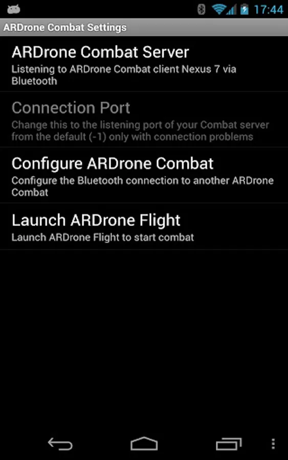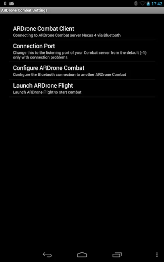 It uses Bluetooth to pass combat information to another Android device running the ARDrone Combat add-on.