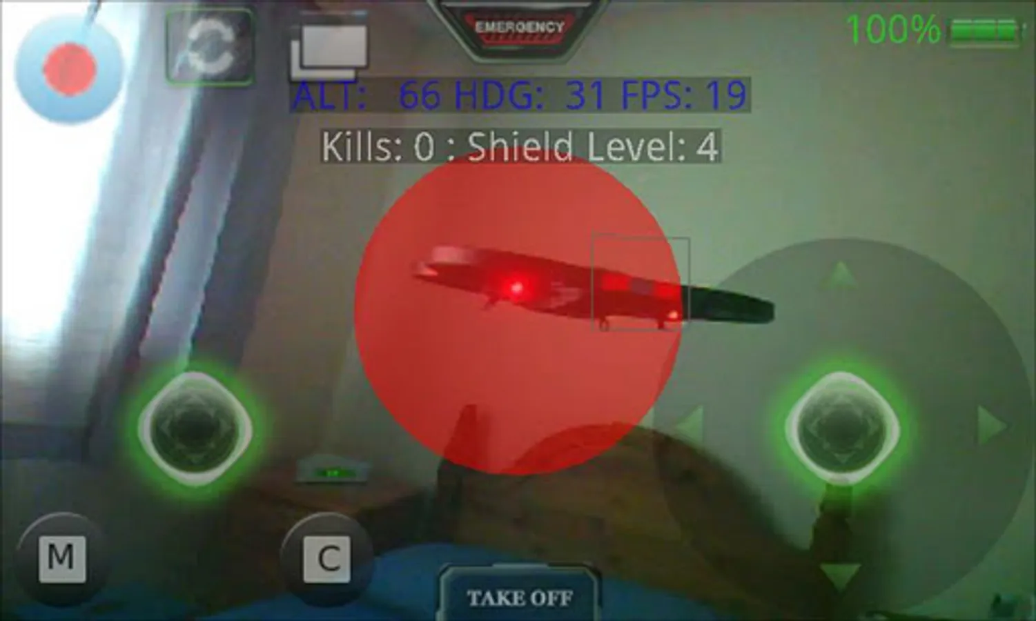 When a successful Bluetooth connection is made to your opponent, then ARDrone Flight will show the combat mode, with aiming circle and missile and chaff buttons.