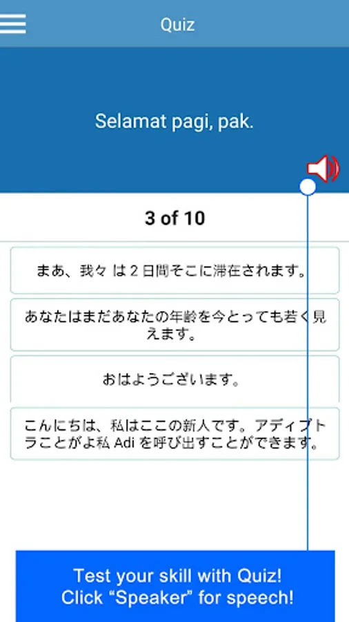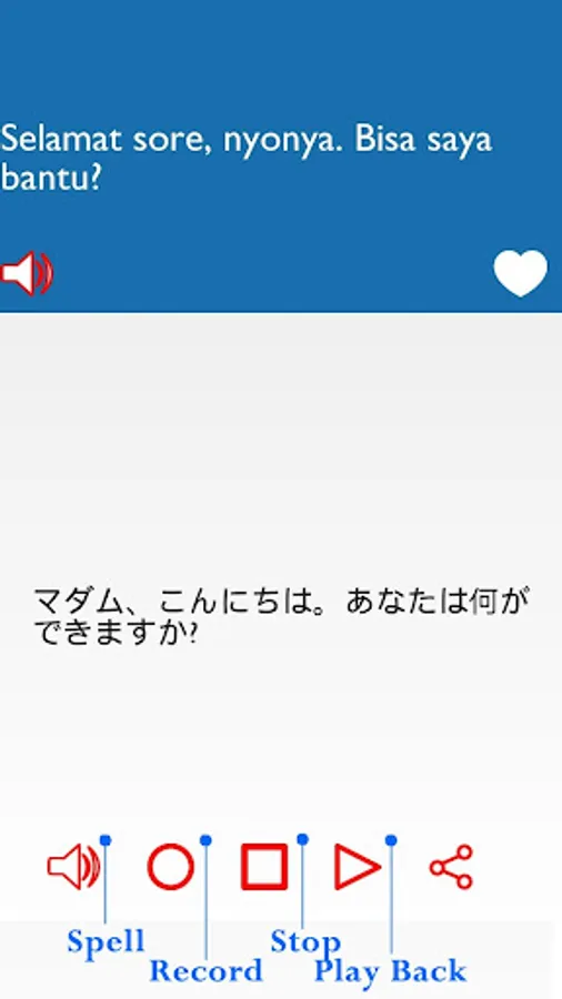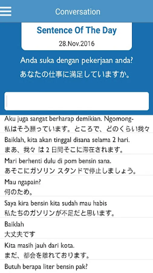Learn to master Indonesia to Japanese with this educative application. It contains some daily conversation examples for different situation & you can add more sentences to enrich your learning journey as application is featured with Text to speech, Recording & Play back, Quiz and other features.