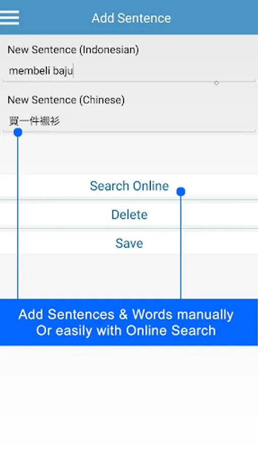 ★ Add new sentences manually or search online feature button